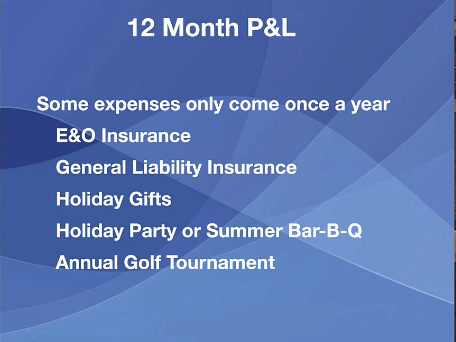 The first thing you will need is a twelve-month profit and loss statement. Why twelve months? Some of your expenses only come once a year, and so we want to make sure that they get allocated across all the projects you work on.