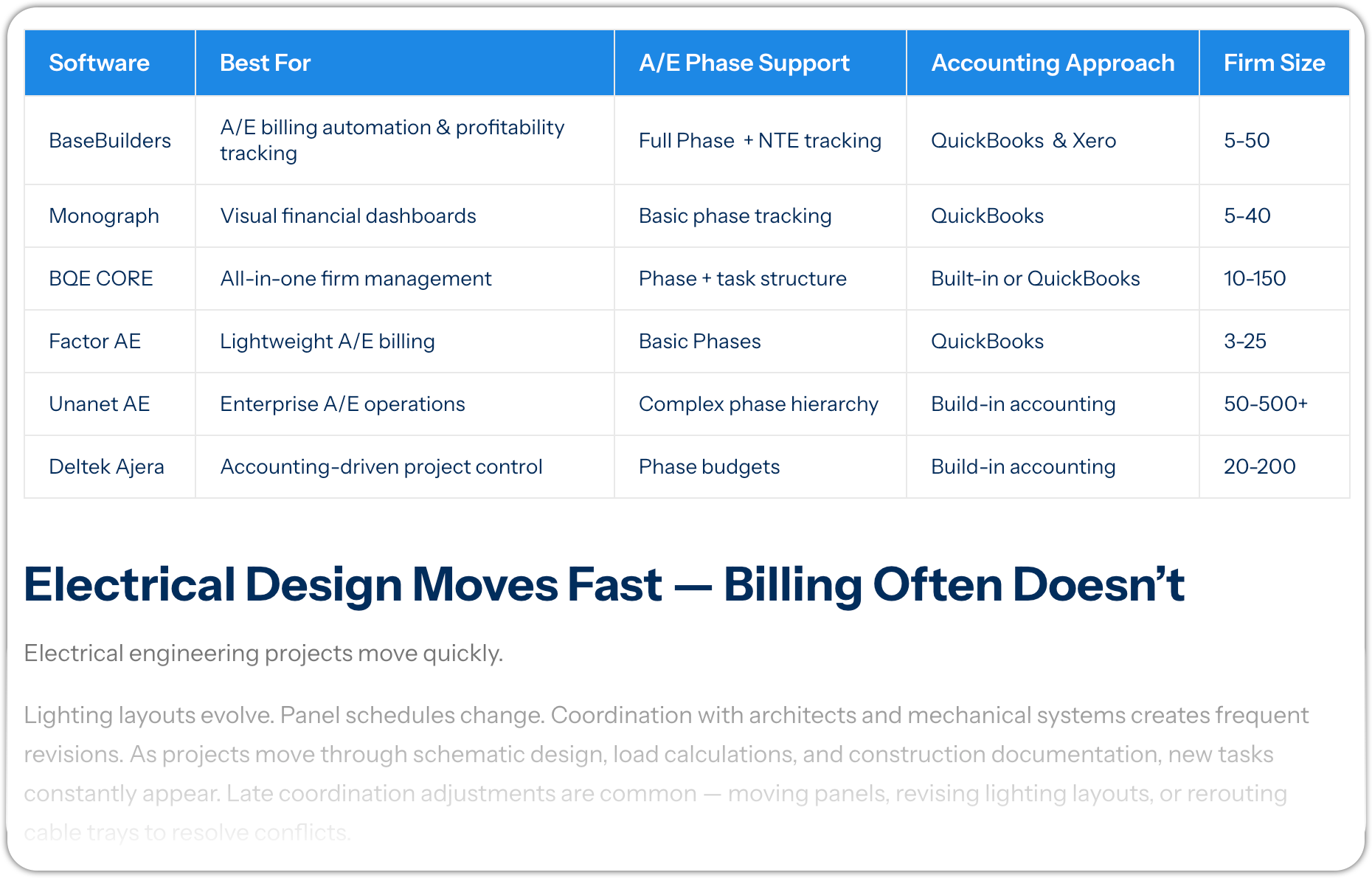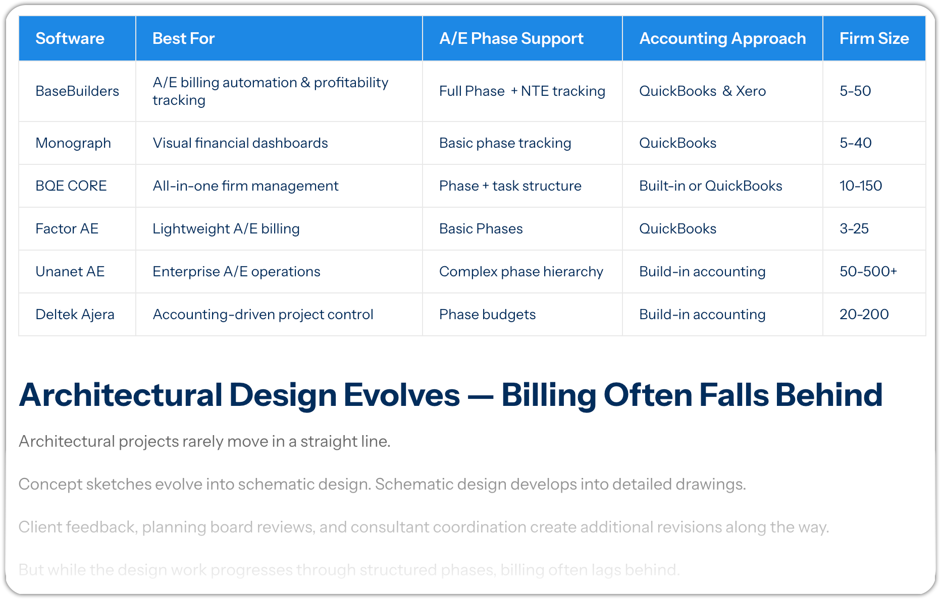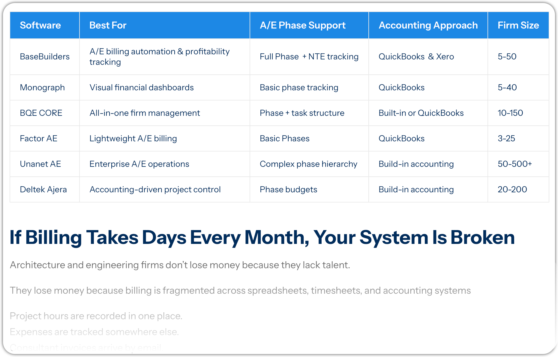 - (spreadsheets, generic PM tools, accounting-first systems, A/E-specific platforms)